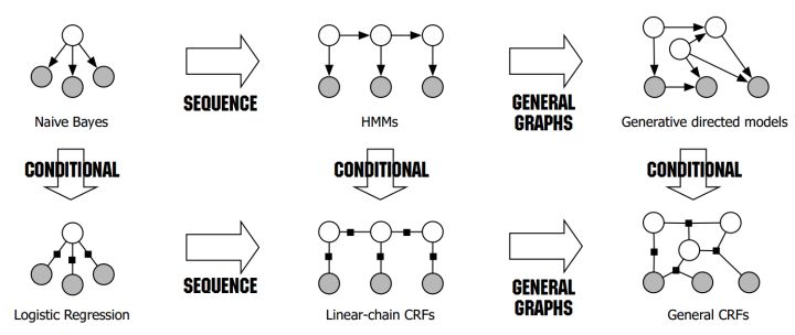 应该看到了熟悉的图了,现在看这个图的话,应该可以很清楚地get到他所表达的含义了。这张图的内容正是按照生成式&判别式来区分的,NB在sequence建模下拓展到了HMM;LR在sequence建模下拓展到了CRF。